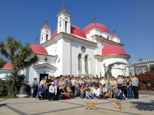 22.02 wyruszyliśmy do Kany Galiliejskiej, gdzie po drobnych zakupach celebrowaliśmy Mszę św., w czasie której małżonkowie odnowili swoje ślubne przysięgi i zakupili stosowne certyfikaty potwierdzające ten fakt. Po zobaczeniu kamiennych stągwi wyruszyliśmy nad Jezioro Galilejskie, gdzie podziwialiśmy mozaiki w Tabgha, przeżyliśmy wspaniały rejs ze Słowem Bożym, wspólnym śpiewem i zabawą. Następnie pojechaliśmy do Kościoła Prymatu Piotra, do Kafarnaum, gdzie obok ruin Synagogi i domu św. Piotra podziwialiśmy także piękną Cerkiew, a obok niej fotogeniczne pawie i koty.